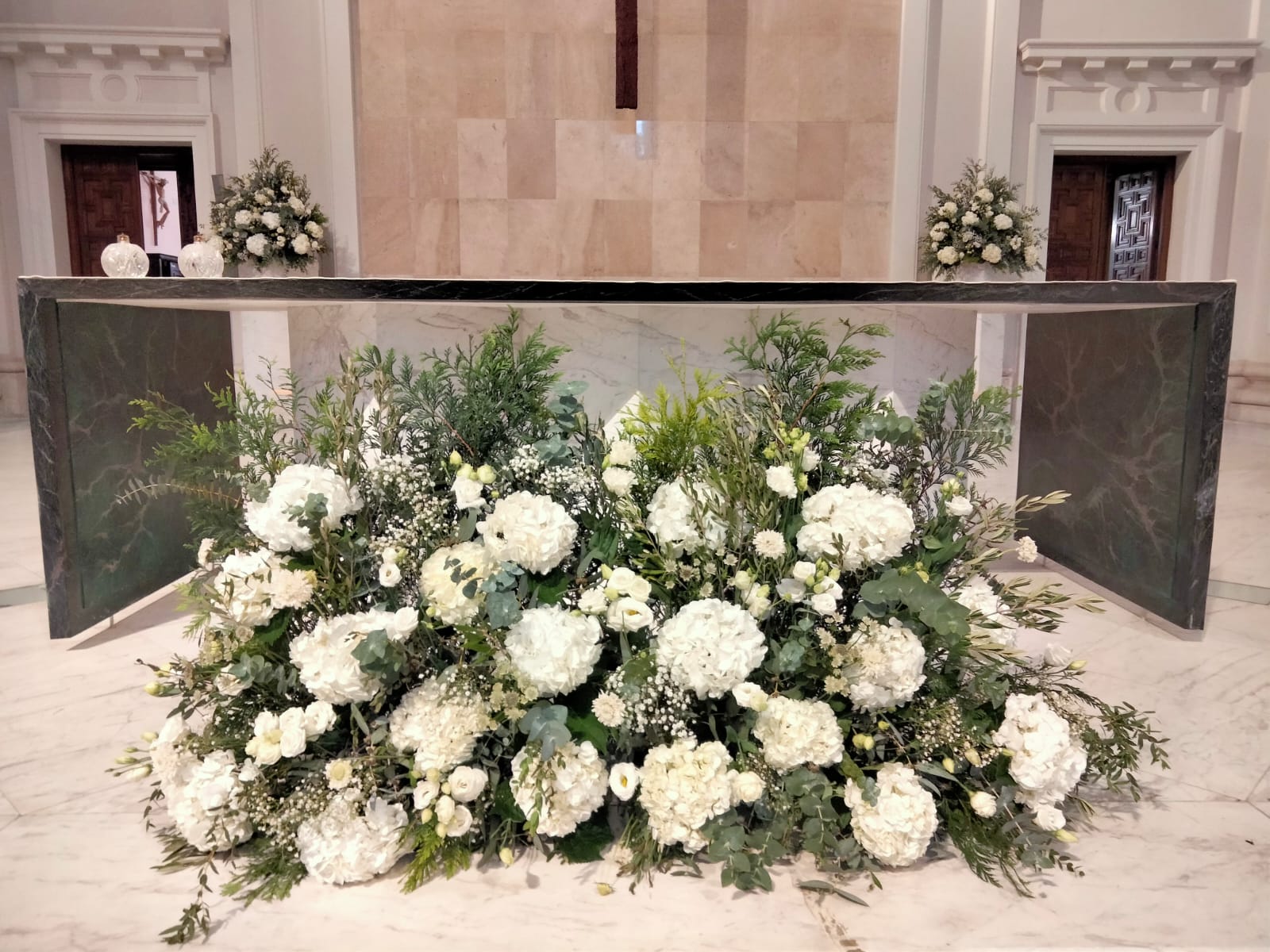 Decoración de San Francisco de Borja con hortensia blanca como flor principal. Trabajo romántico y elegante.